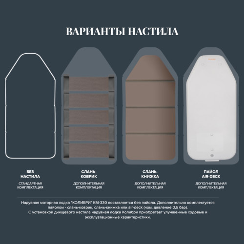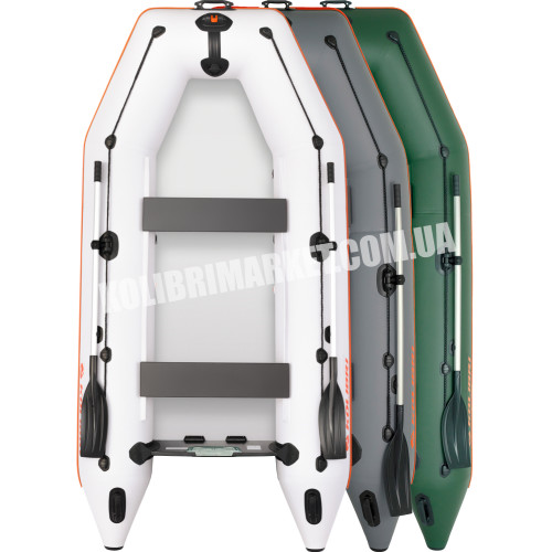 Моторная лодка КОЛИБРИ КМ-330 NEW - плоскодонная надувная лодка ПВХ серия STANDART (мотор до 12 л.с). Может использоваться как с мотором так и без него, на веслах. Очень удобная, практичная и функциональная модель. Базовая комплектация без настила, но для удобства и разных условий эксплатации всегда в наличии три варианта пайола: слань-коврик, слань-книжка, надувной настил Air-deck. Может эксплуатироваться без настила.