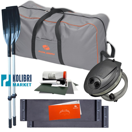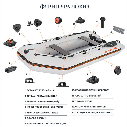 - Корпус: привальный брус (70 мм) с защитой от брызг, леерный шнур, фирменные уключины «КОЛИБРИ».