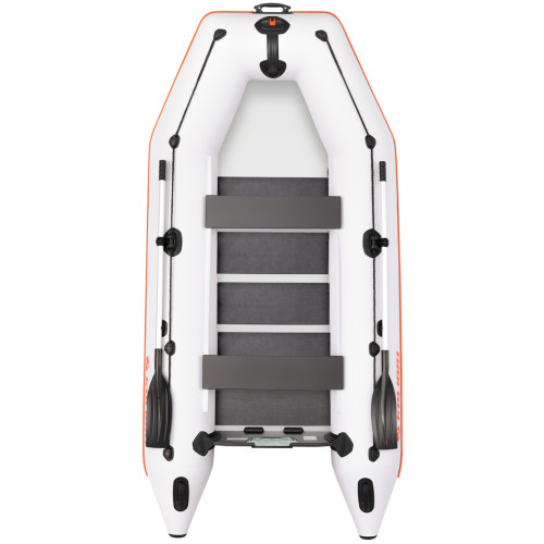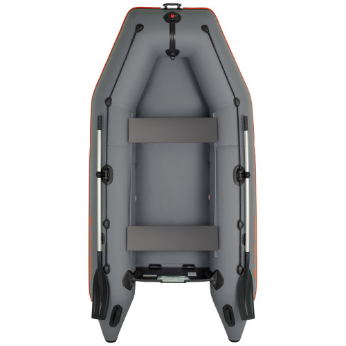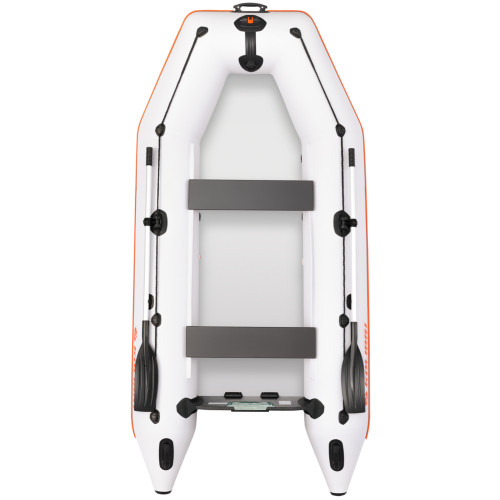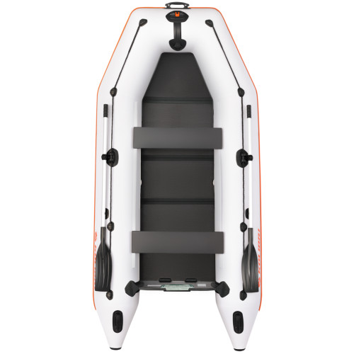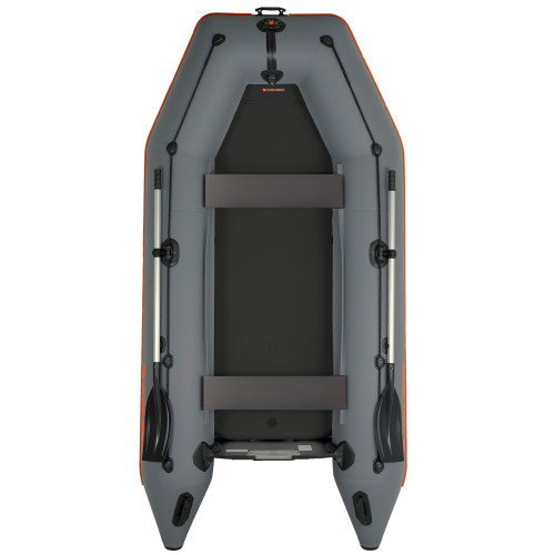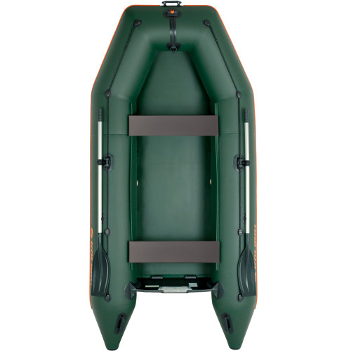 При длине 3,3 метра и ширине 1,6 метра лодка обладает увеличенным диаметром баллона и защищена по периметру привальным брусом с функцией брызгоотбойника. Носовая часть оборудована рымом для якоря и удобной ручкой. Транец выполнен из прочной фанеры с усиленными креплениями и дополнен регулируемой металлической накладкой. Баллоны (42 см) разделены на 3 независимых отсека, оснащены качественными воздушными клапанами и двумя клапанами автоматического сброса лишнего давления. По верху баллонов проходит страховочный леер. Гребная группа включает быстросъемные весла с лопастями улучшенной формы. Система передвижных сидений (банок) позволяет настроить внутреннее пространство под себя. На конусах баллонов установлены современные заглушки и усиленные ручки для переноски.