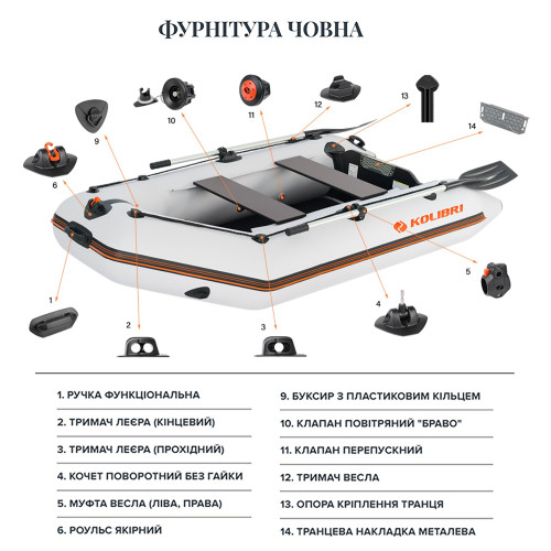 Наружная часть баллонов: привальный брус 70 мм с брызгоотбойником по периметру, верёвочный леер поверх баллонов, две уключины KOLIBRI.