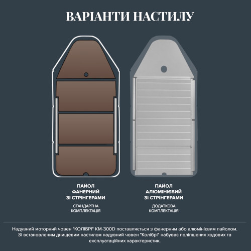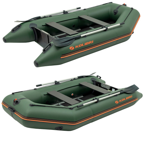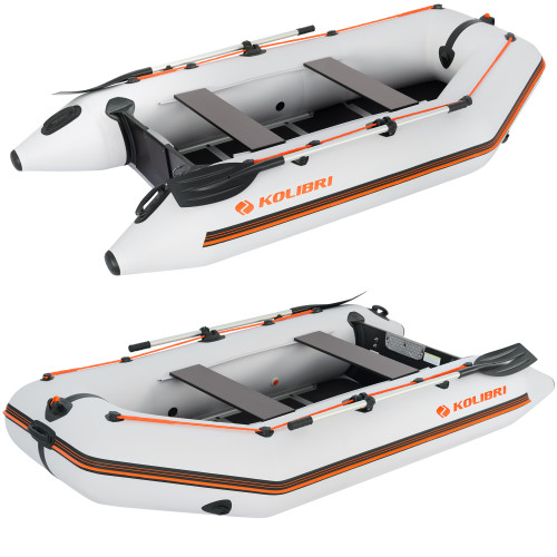 Лодка KOLIBRI КМ-300D NEW серии «ПРОФИ» — трёхместное надувное судно с килем и жёстким разборным палубным настилом. Габариты лодки: длина — 3 м, ширина — 1,6 м. Несмотря на скромную длину, модель имеет высокий баллон диаметром 42 см, что обеспечивает отличный запас плавучести и устойчивости.